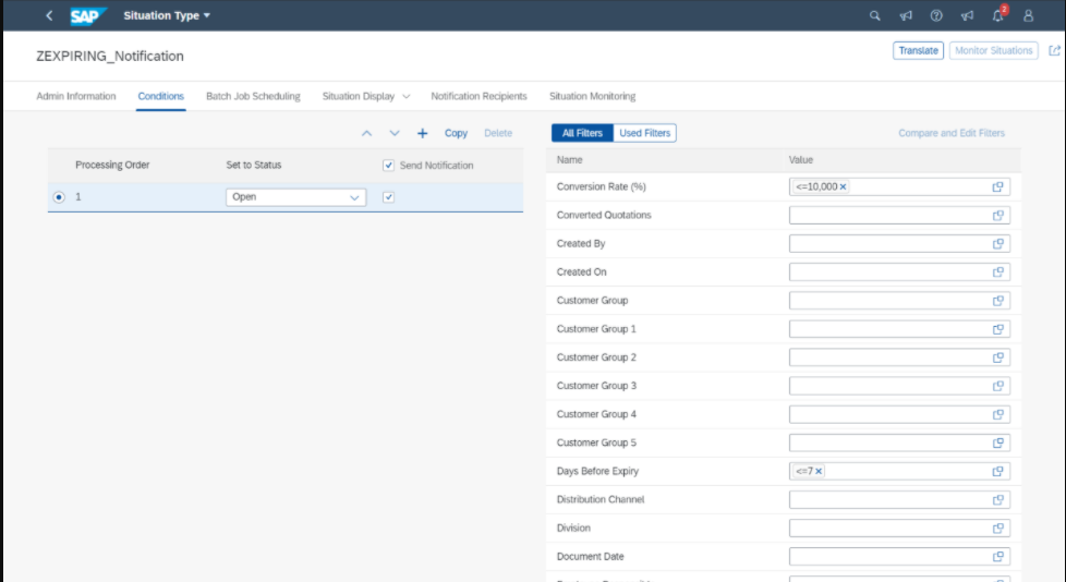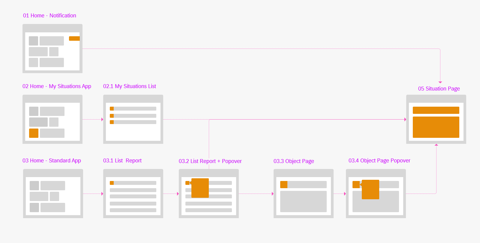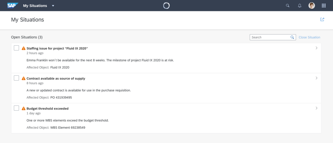 Les situations vous notifient d’un cas exceptionnel qui nécessite votre attention. Il est possible de cliquer dessus afin d’être dirigé vers la page correspondante afin d’agir sur la situation. Bien qu’intégrer dans certaines applications FIORI, vous pouvez également intégrer l’accès à ces situations dans vos propres applications, pour cela, il convient de respecter les préconisations de l’éditeur.
